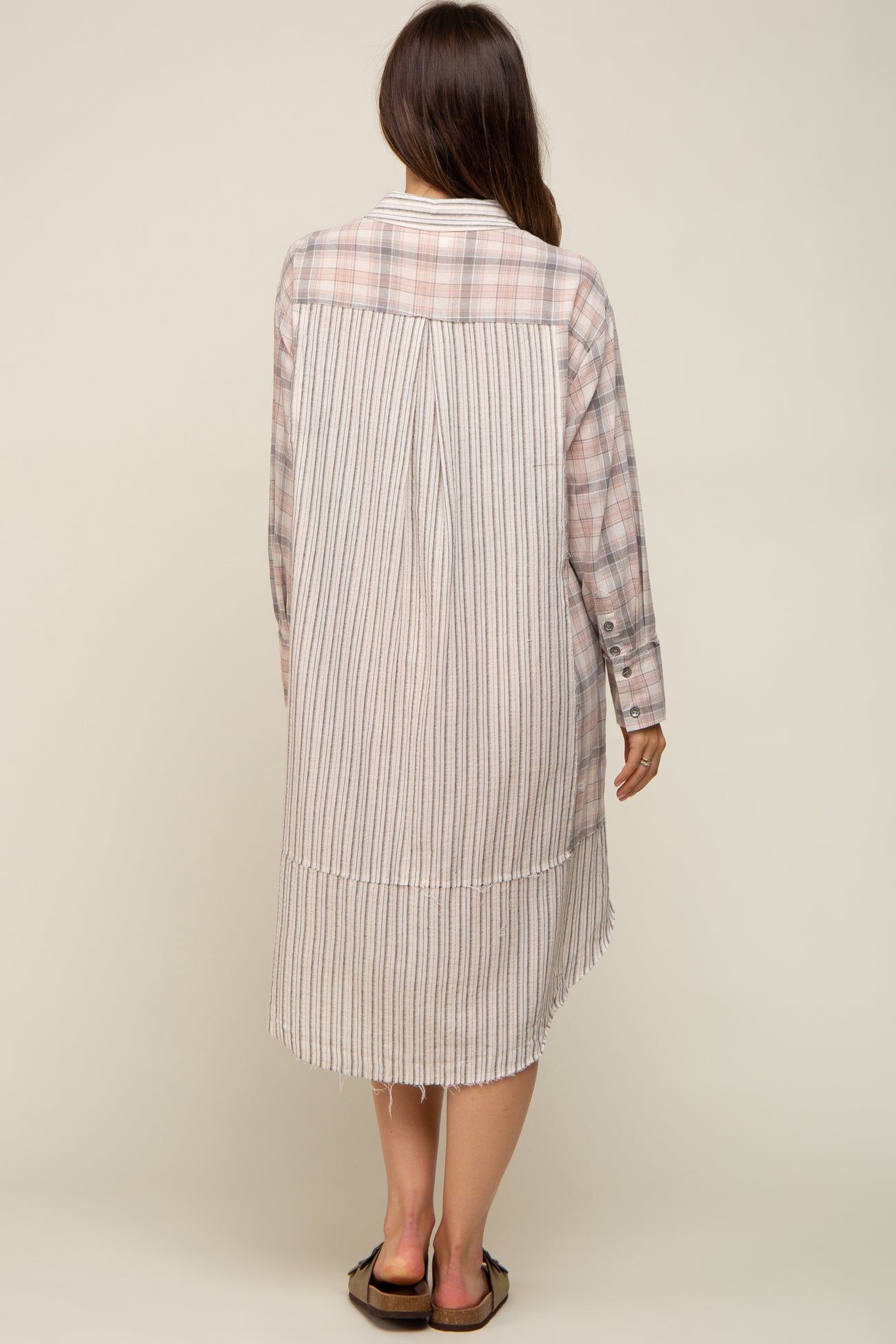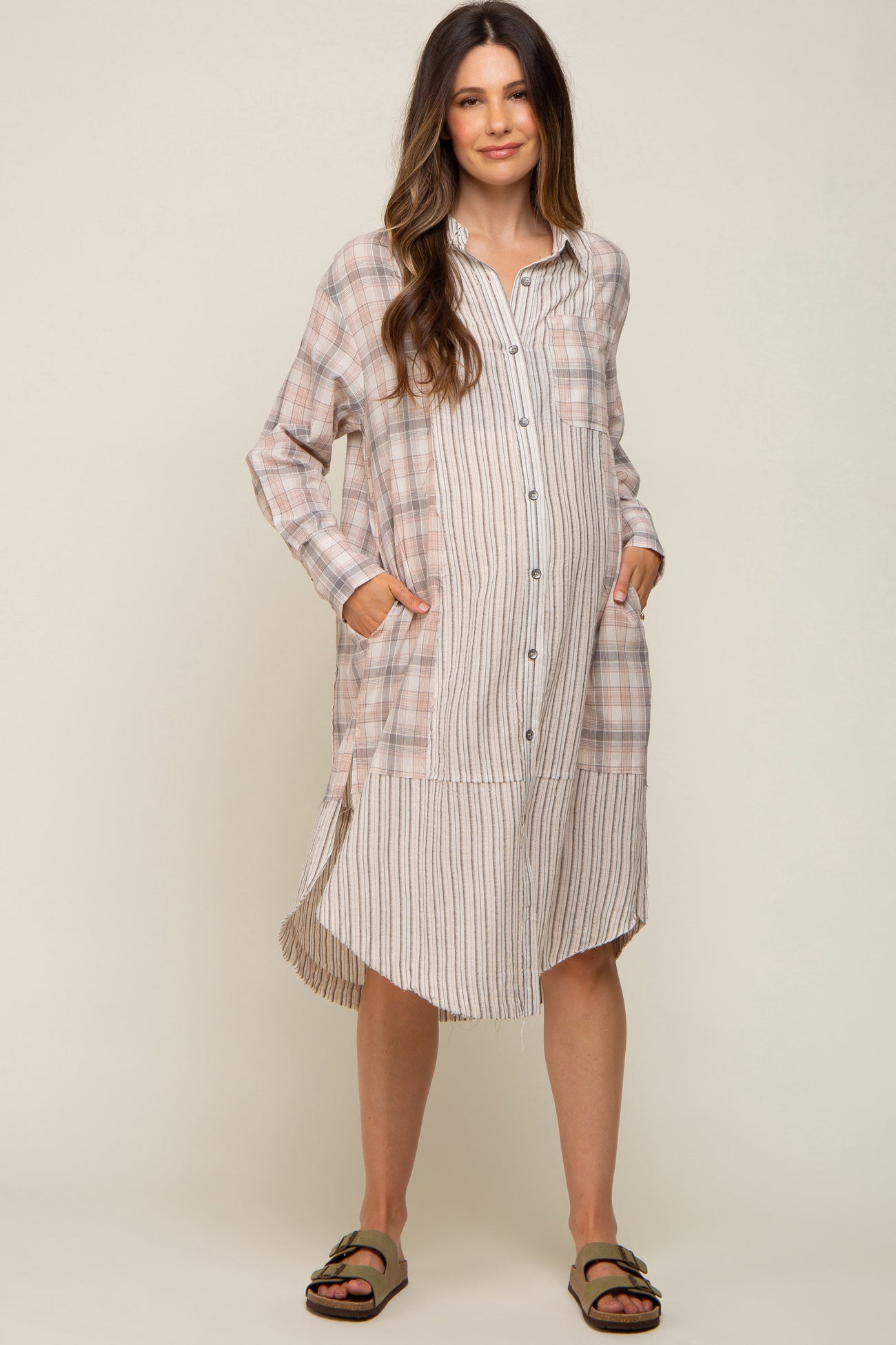 A contrasting plaid print maternity shirt featuring a button down front, long sleeves, a front pocket, a curved hem and a collared neckline.