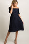 A polka dot print dress with smocked bust featuring short sleeves, an off shoulder neckline, and a slight ruffle trim.