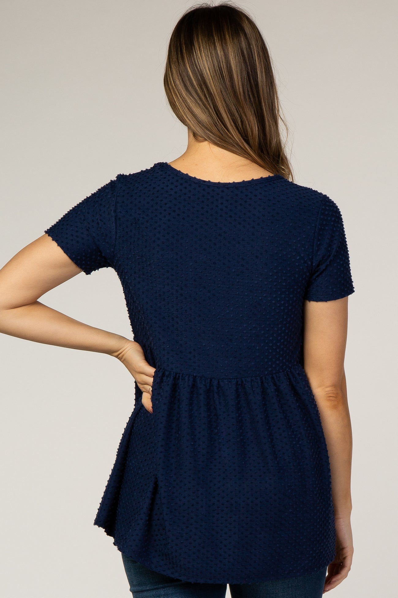 A maternity peplum top featuring a swiss dot texture, short sleeves and a rounded v-neckline.