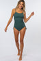 A soild hued, ribbed on piece maternity swimsuit featuring cinched side ties at hips, a square neckline, adjustable straps, ruched sides, removeable padded cups, built in bra, metal buckle clasp, U shaped cutout on back, and a double lining.