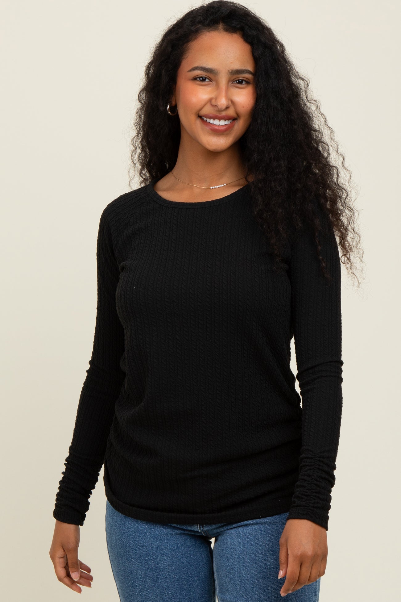 Black Solid Ribbed Ruched Long Sleeve Maternity Top