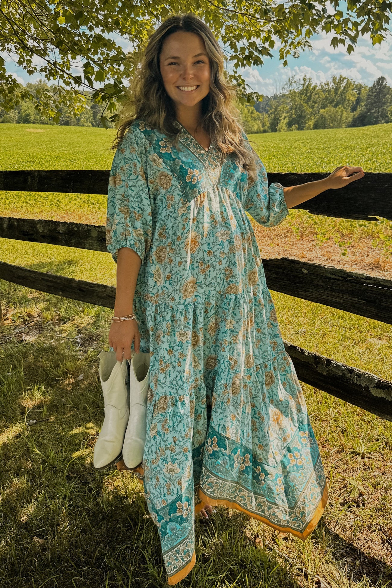 Aqua Floral Border Print V-Neck Tiered Maternity Midi Dress