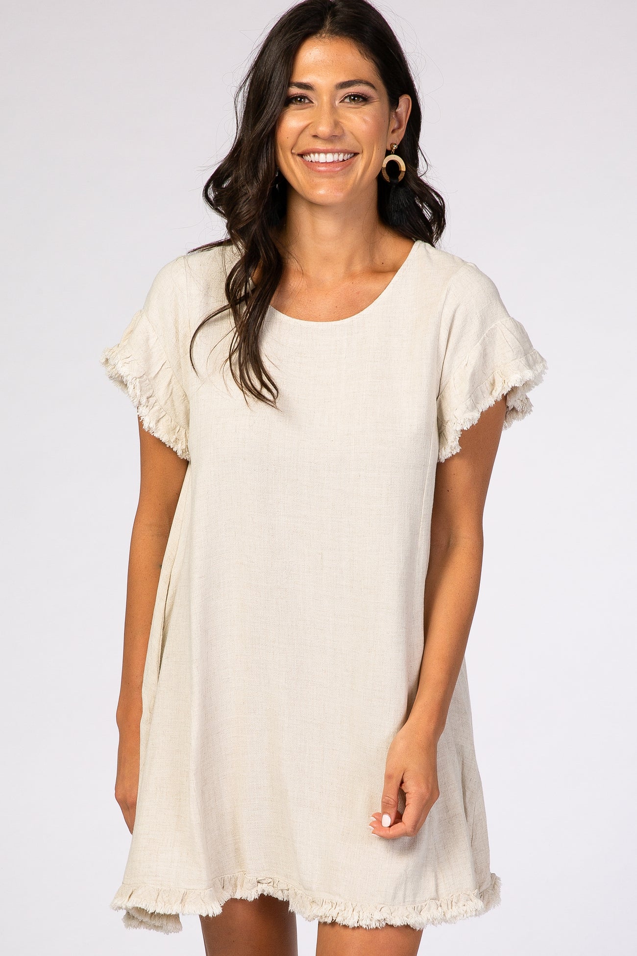 A solid hue dress featuring, a rounded neckline, short sleeves, side pockets and fringe detailing.