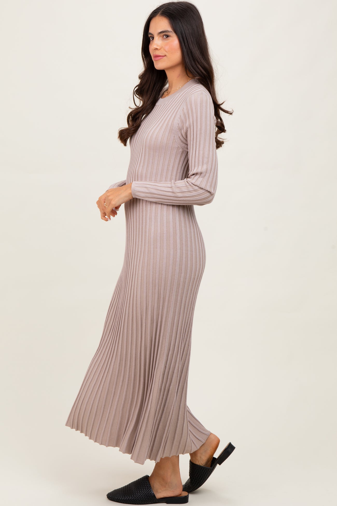 Beige Ribbed Long Sleeve Sweater Midi Dress
