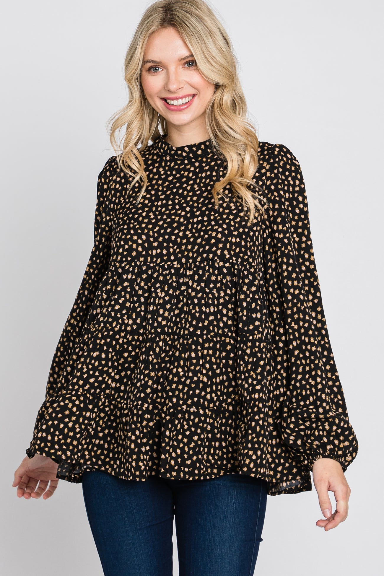 An animal printed top featuring a mock neckline, ruffle tiers, long sleeves and a back keyhole cutout with a button closure.