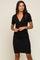 A rib knit dress featuring a wrap v-neckline, short sleeves, and a ruched skirt. Dress is lined.