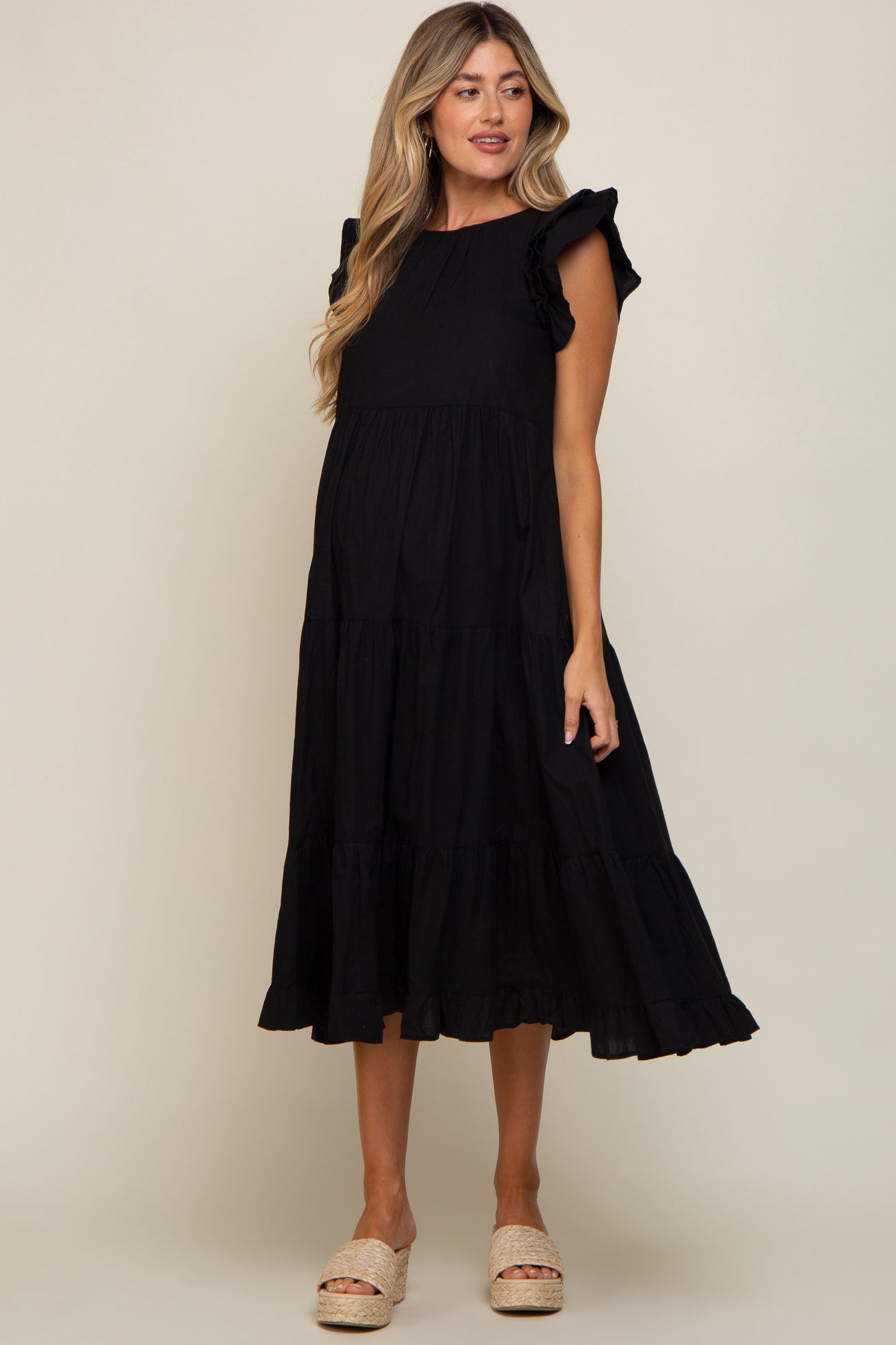 Black Ruffle Shoulder Tiered Maternity Midi Dress