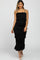 A solid satin midi dress featuring a smocked elastic body with ruffle trim and adjustable cami straps.