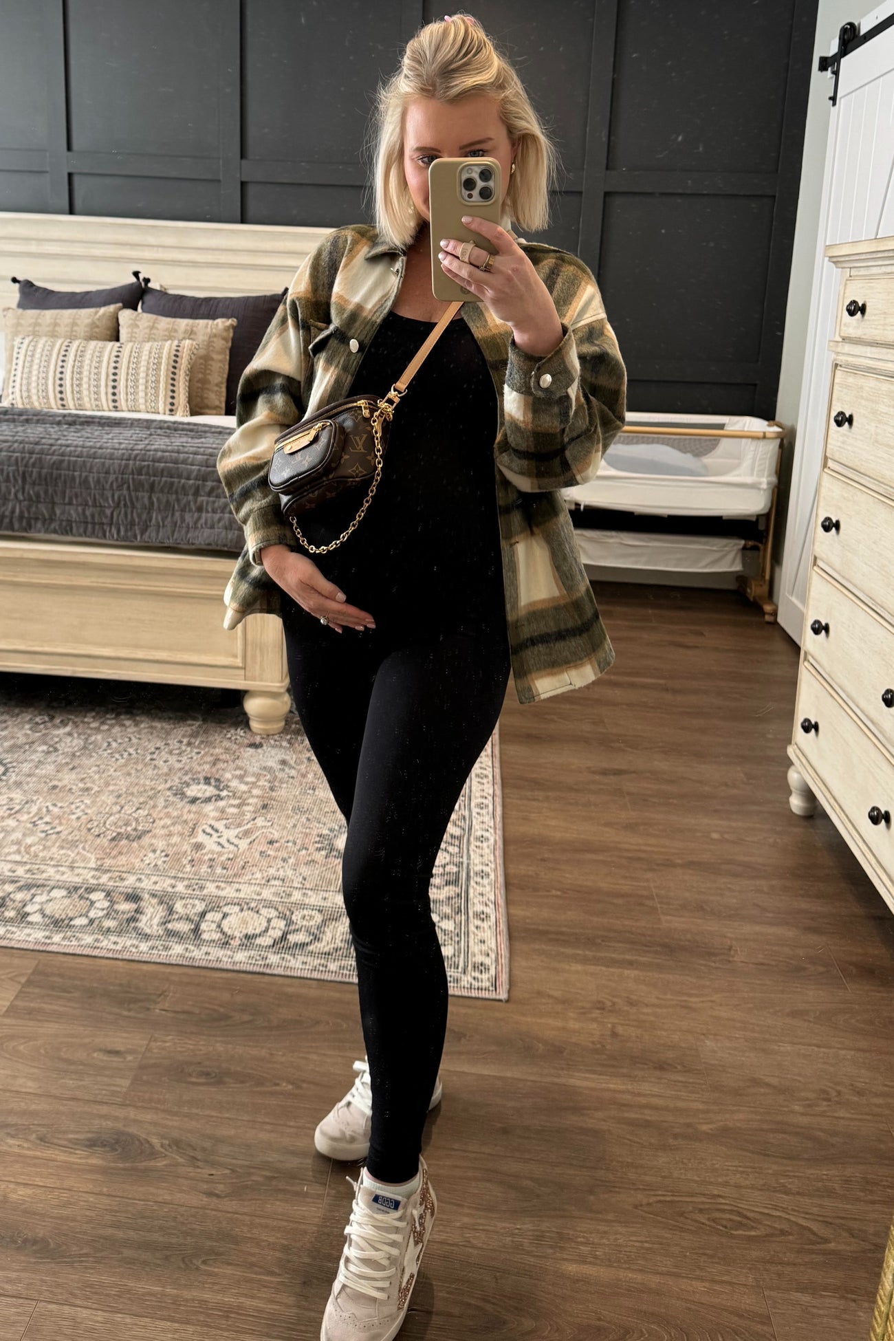A solid sleeveless maternity one piece. Fitted.