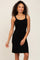 A solid hued ribbed sleeveless dress. Rounded neckline.
