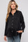 A striped maternity top with a collar, front functioning buttons, long drop shoulder sleeves, and a curved hi-lo hem.