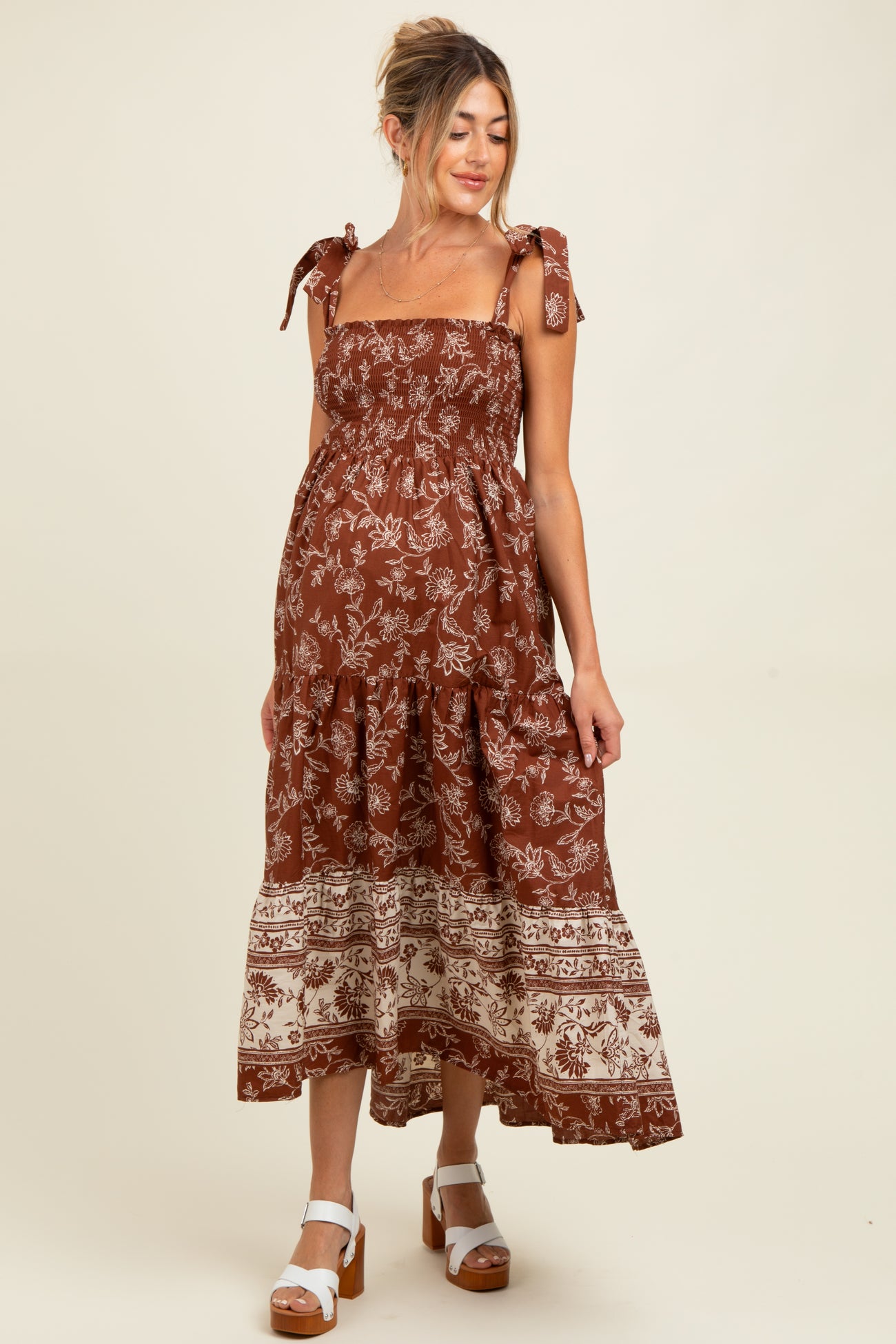Brown Floral Smocked Shoulder Tie Maternity Maxi Dress