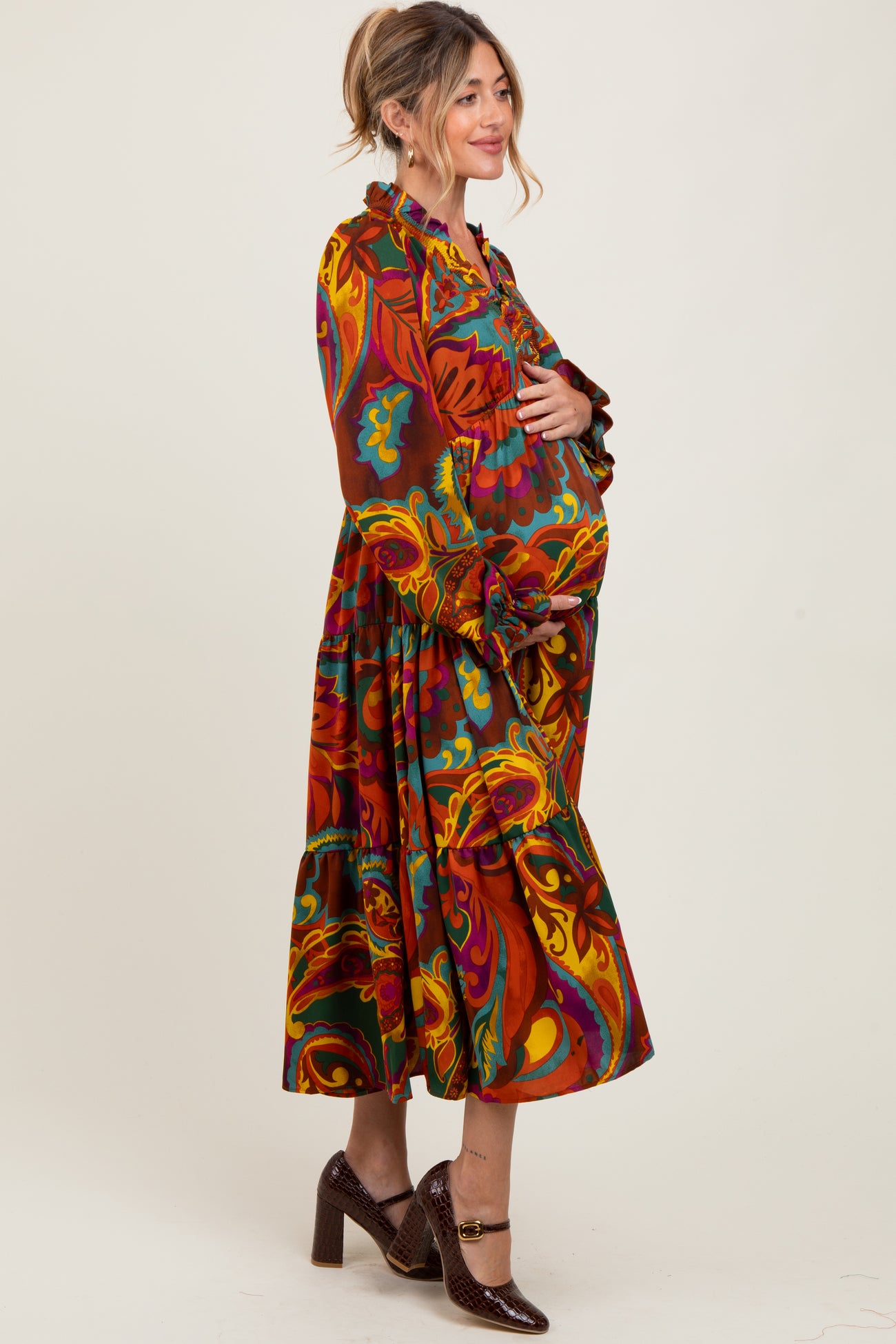 Brown Paisley V-Neck Long Sleeve Tiered Maternity Maxi Dress