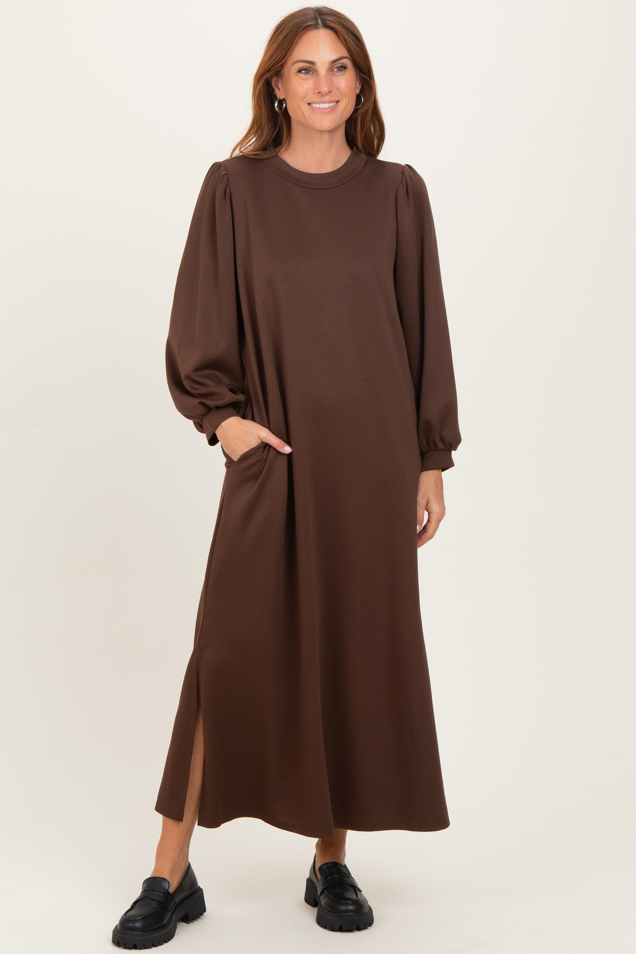 Elevate your everyday style with our Brown Side Slit Detail Solid Midi Dress. Crafted for comfort and elegance, this midi dress features a relaxed fit with subtle side slits for ease of movement. The long puff sleeves with cuffed wrists add a touch of sophistication, while the rich brown hue offers timeless versatility. Made from a soft, breathable fabric, it’s perfect for any season. Dress it up with heels or keep it casual with loafers. Practical and stylish, this dress also includes discreet side pockets for convenience. Effortlessly chic and perfect for your wardrobe essentials!