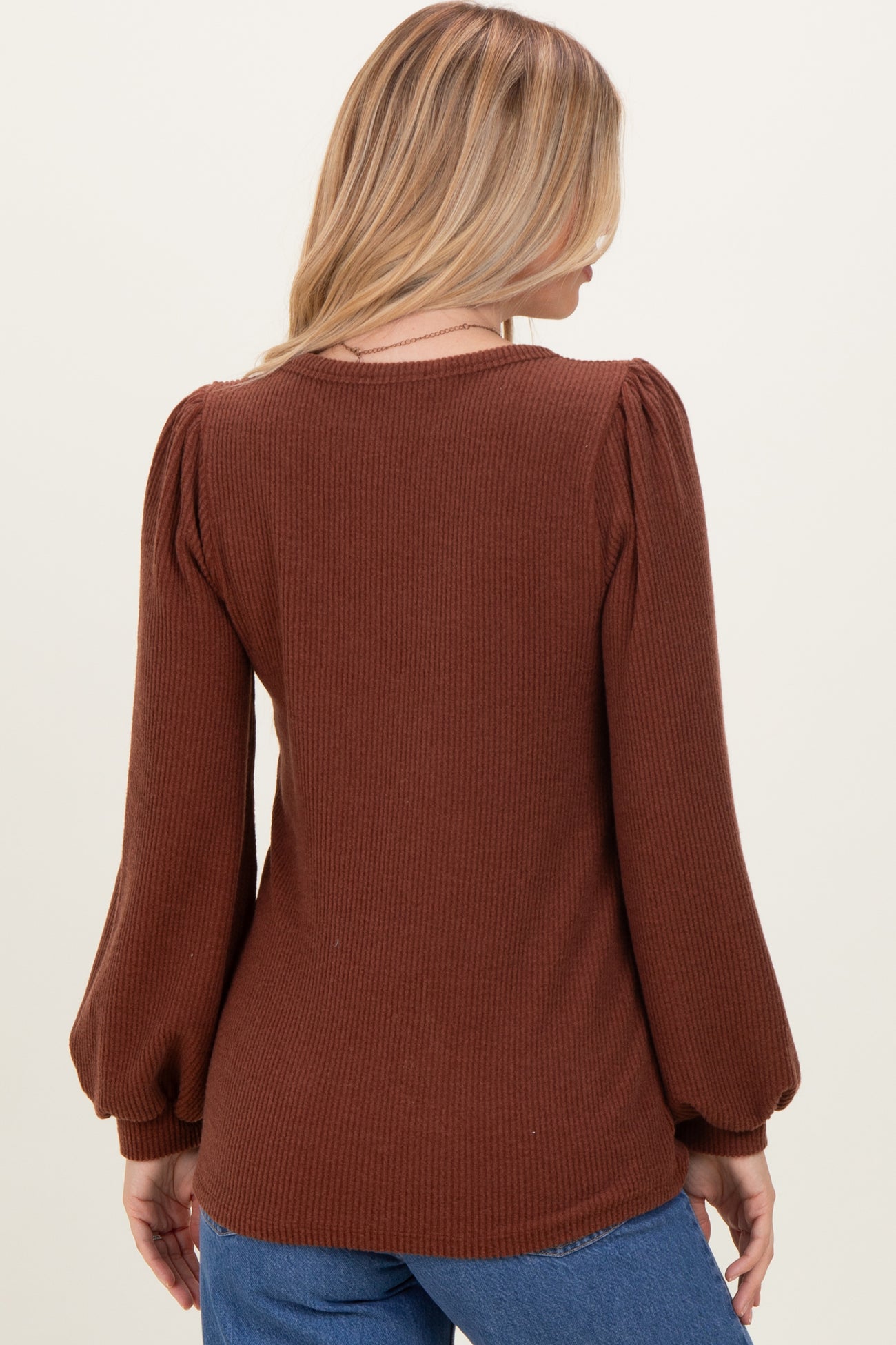 Elevate your everyday style with this Brown Solid Ribbed Long Sleeve Tunic Top. Crafted from a soft, ribbed fabric, it offers comfortable stretch and a flattering fit. The elegant V-neckline adds a subtle touch of sophistication, while the puffed long sleeves bring a trendy, feminine silhouette. Perfect for layering or wearing on its own, this versatile tunic pairs effortlessly with jeans, leggings, or skirts for an easy, chic look. Ideal for casual outings, work, or cozy weekends, this top is a wardrobe essential that combines comfort and style with ease. Available in sizes designed to fit you perfectly.