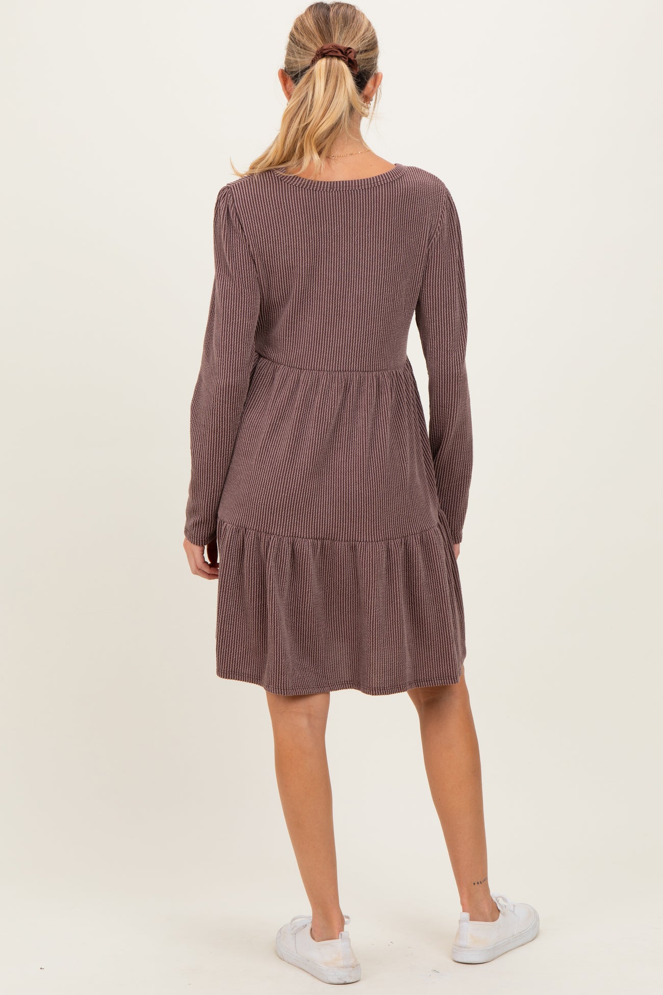 Embrace comfort and style with our Brown Textured Rib Tiered Long Sleeve Maternity Dress. Crafted from soft, breathable ribbed fabric, this dress offers gentle stretch to accommodate your growing bump. Featuring a flattering tiered skirt and long sleeves, it provides cozy coverage for cooler days while maintaining a chic, casual look. Perfect for everyday wear or casual outings, its versatile brown hue pairs effortlessly with sneakers or boots. Designed with an empire waist for comfortable support and effortless maternity style, this dress is a must-have for your pregnancy wardrobe. Easy, stylish, and comfy!