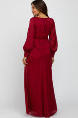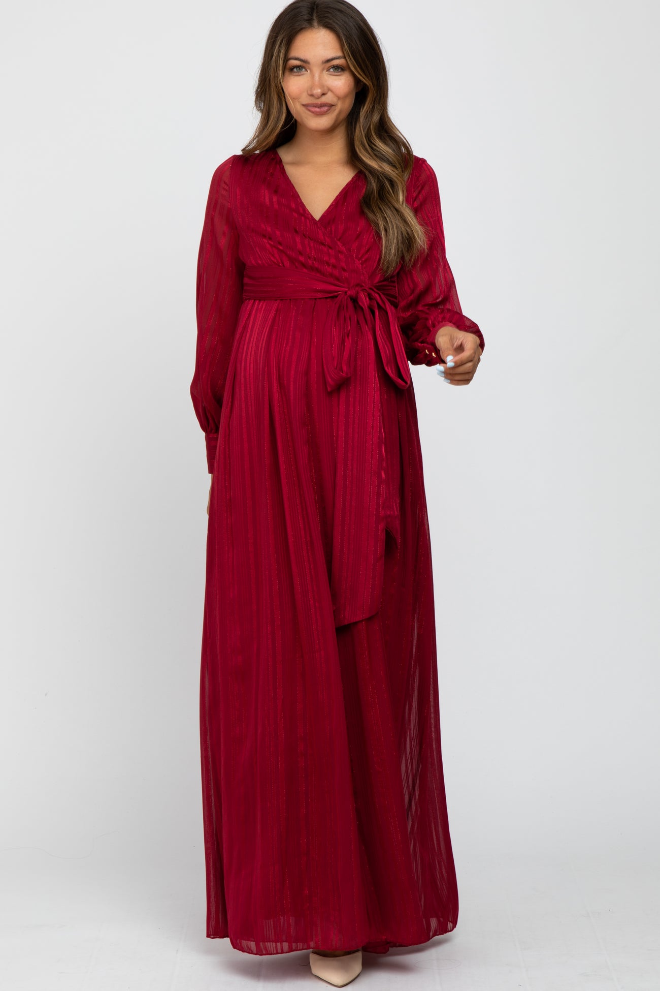 Burgundy Metallic Striped Chiffon Maternity Maxi Dress