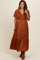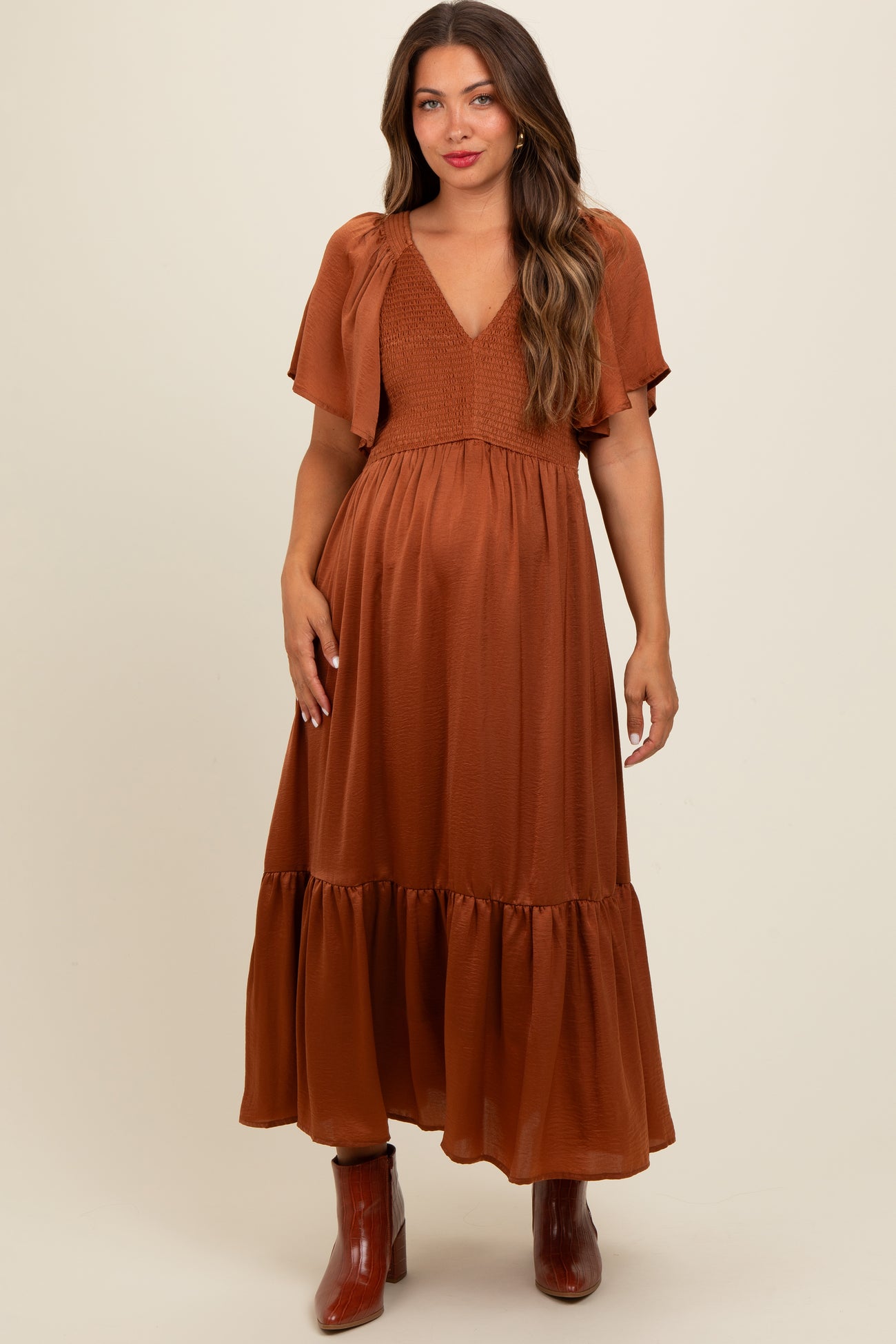Embrace comfort and style with our Camel Satin Smocked Maternity Midi Dress. Crafted from soft, satin-like fabric, this dress features a flattering smocked bodice that gently hugs your growing bump. The V-neckline and flutter sleeves add a feminine touch, while the flowing midi skirt with a ruffled hem offers effortless movement. Perfect for any occasion, from casual outings to special events, this versatile dress pairs beautifully with boots or sandals. Stay chic and comfortable throughout your pregnancy with this must-have maternity dress in a warm camel hue.