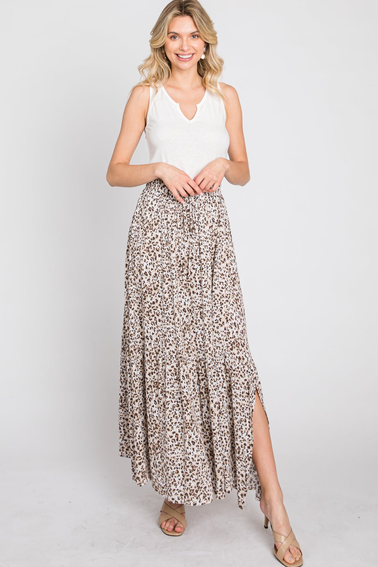 Cream Animal Print Tie Front Maxi Skirt