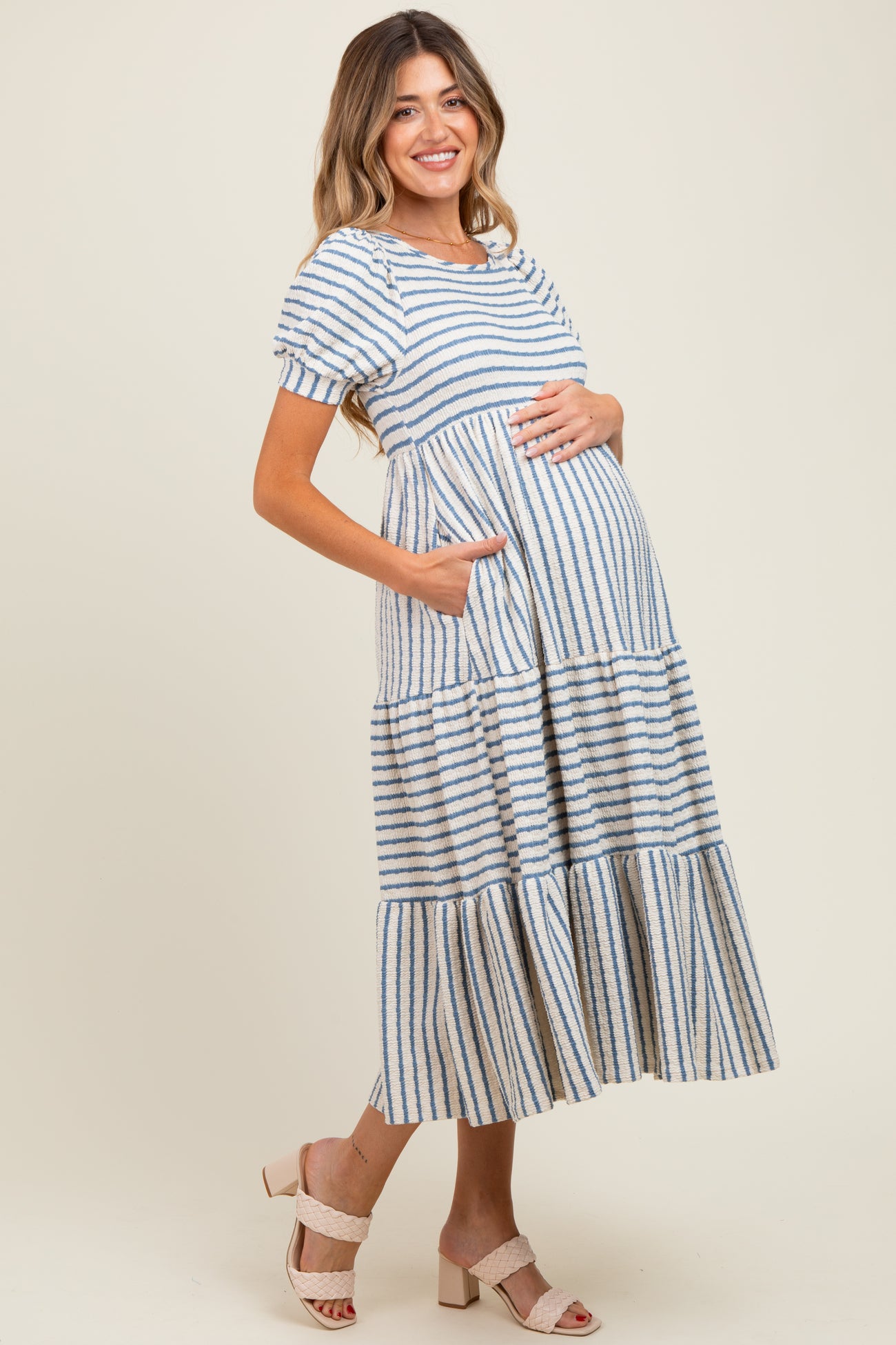 Cream/Blue Striped Short Sleeve Tiered Maternity Maxi Dress