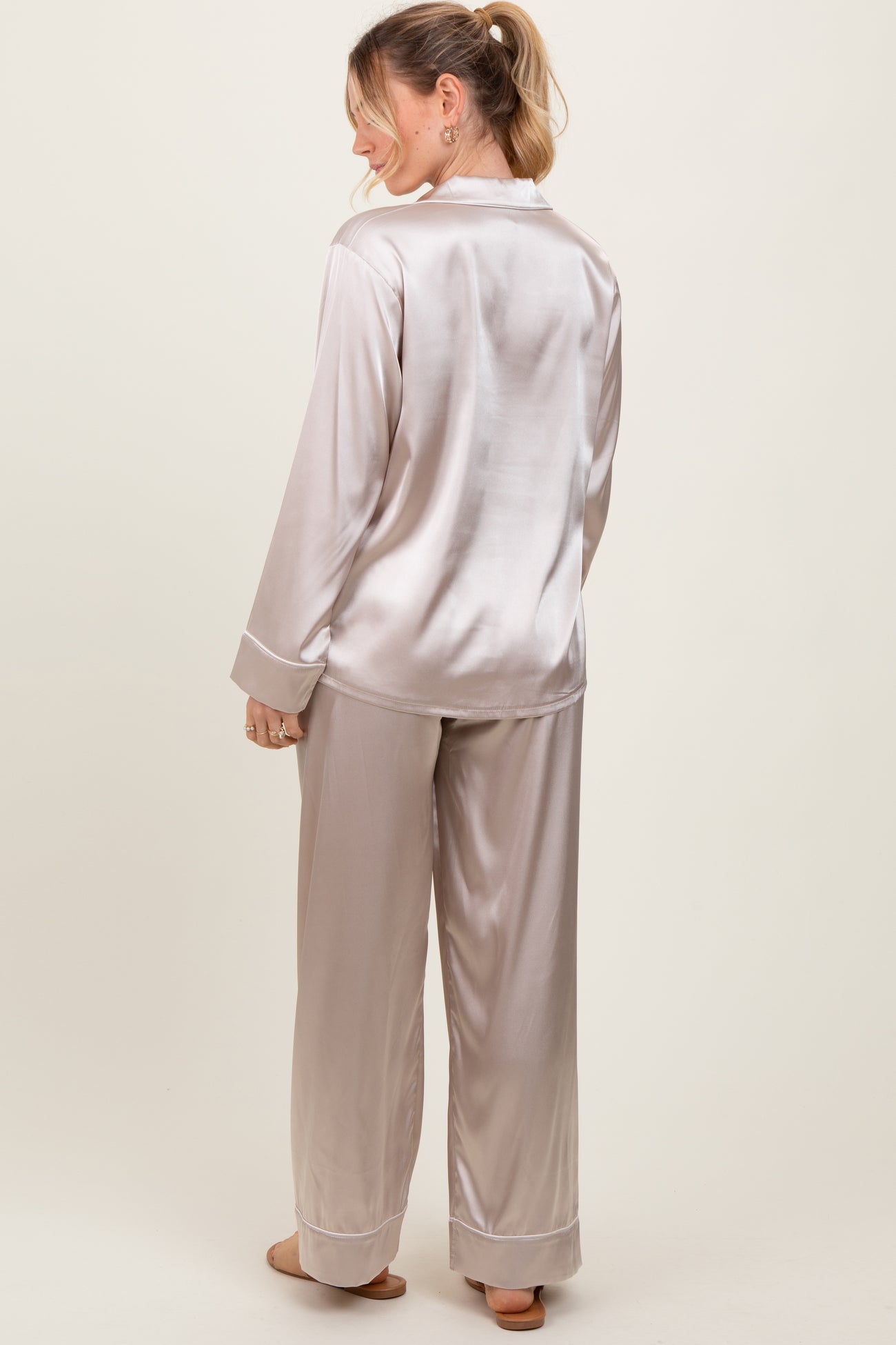 Cream Satin Contrast Trim Long Sleeve Pajama Set