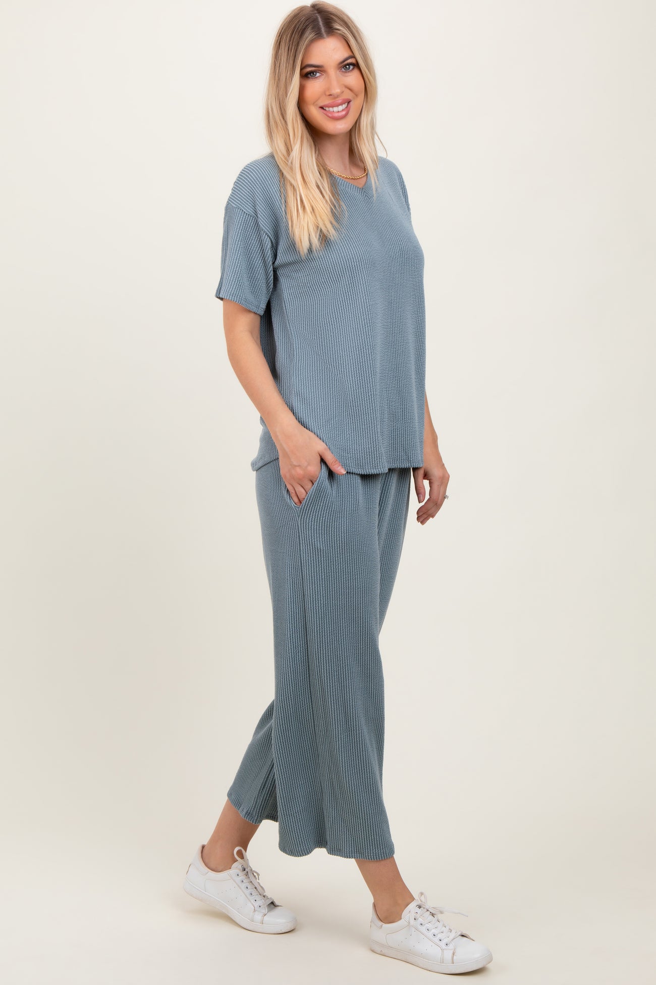 Dark Teal Ribbed Short Sleeve Top Pajama Set