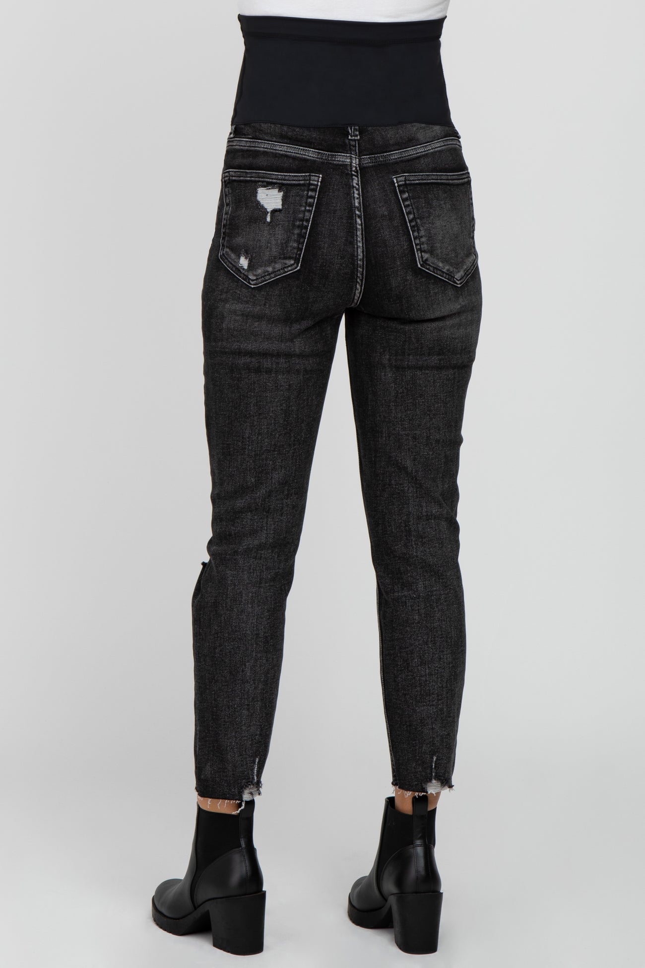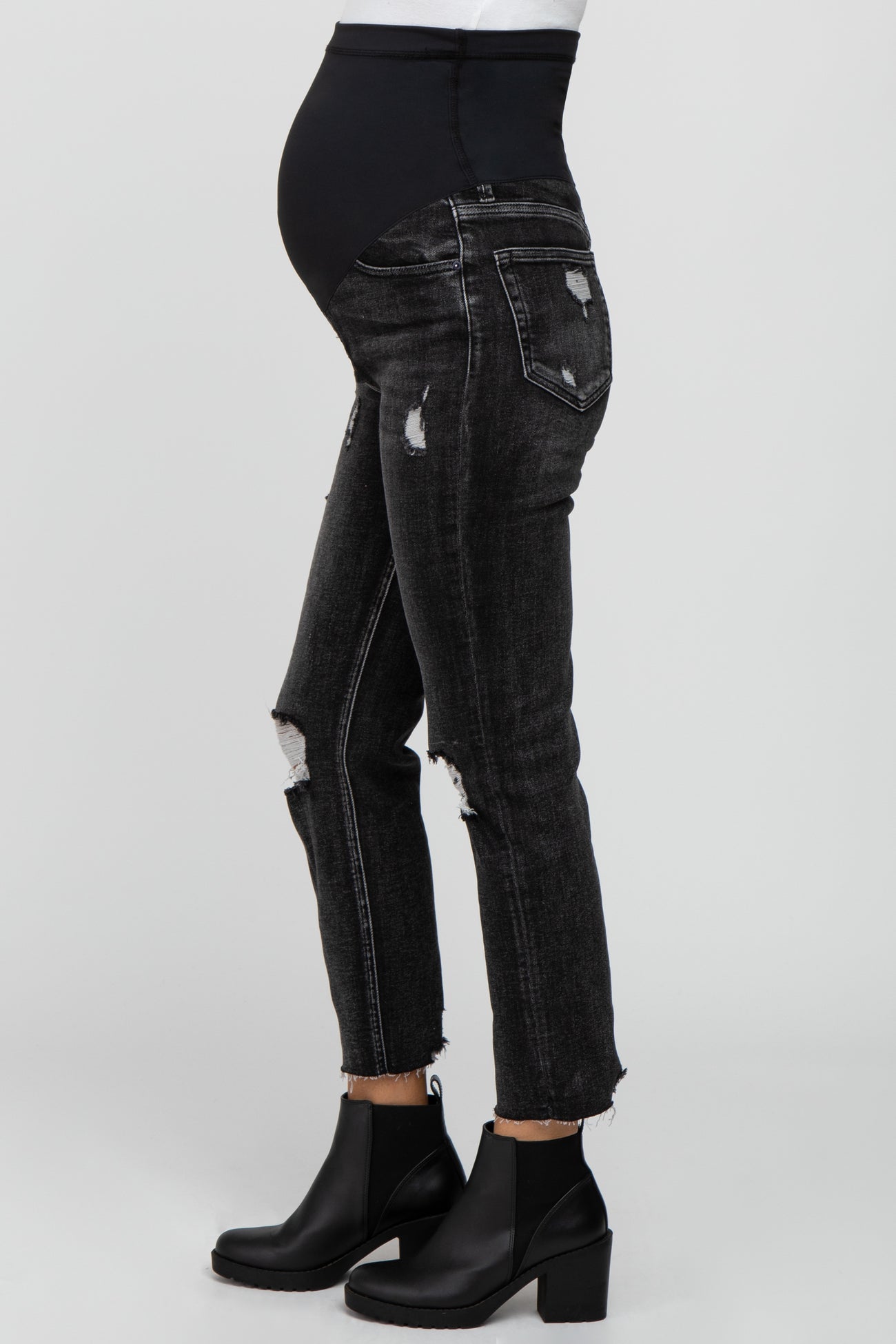 A pair of black washed, crop length maternity jeans featuring distressed detailing, five pockets and an elastic belly band. Material has high stretch.