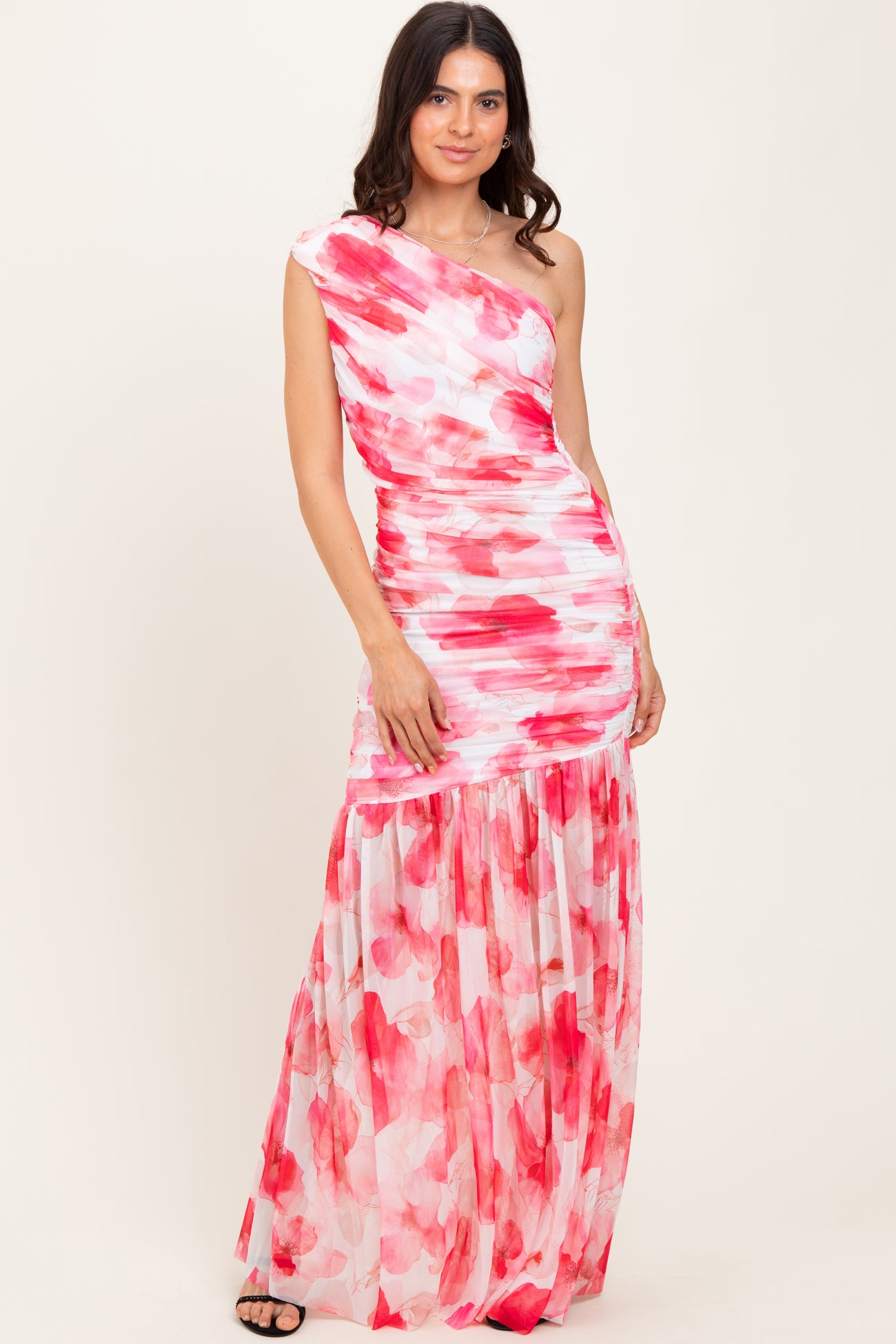 Fuchsia Floral Ruched Mesh One Shoulder Maxi Dress
