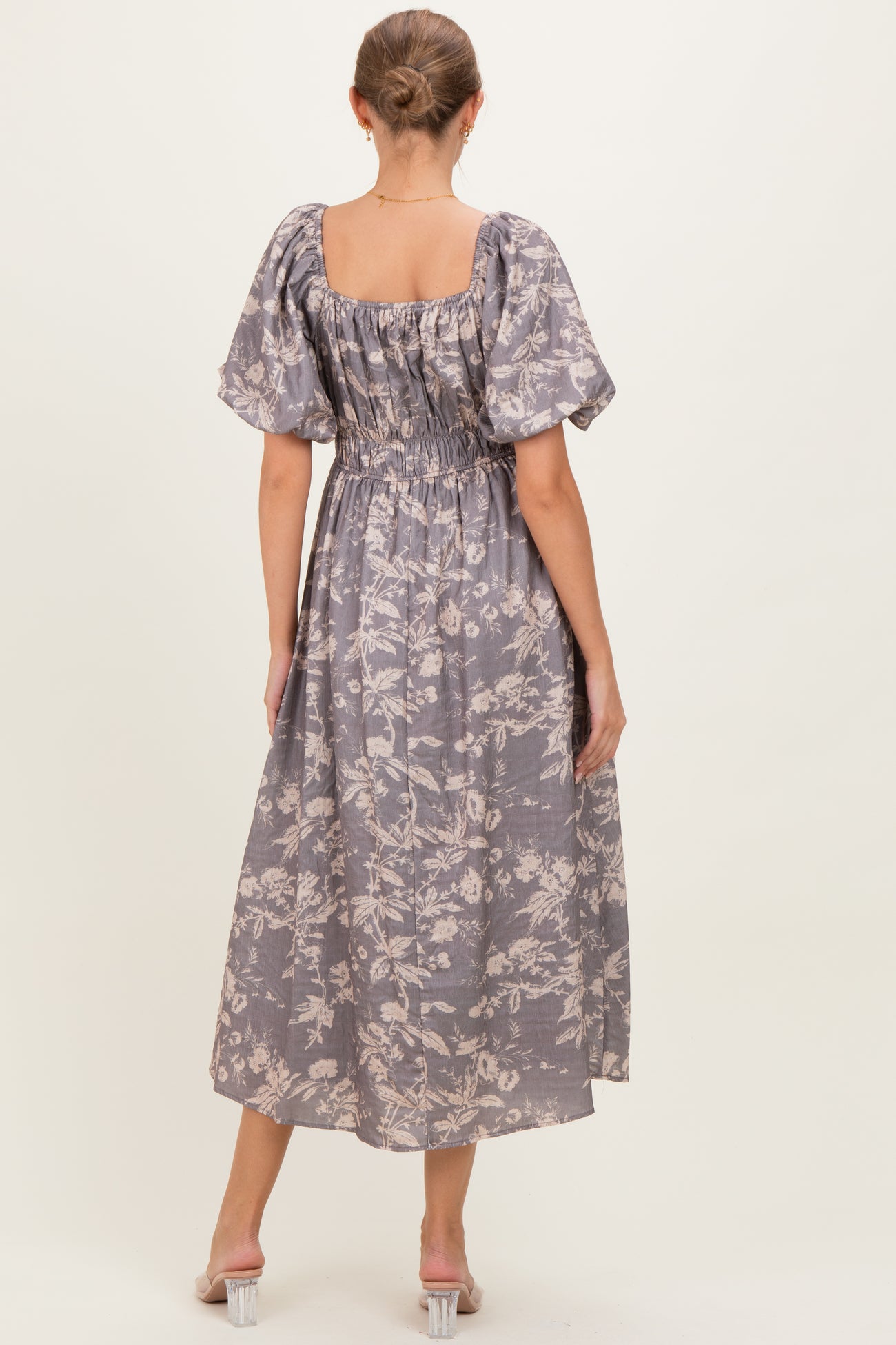 Grey Floral Puff Sleeve Smocked Waist Maternity Midi Dress