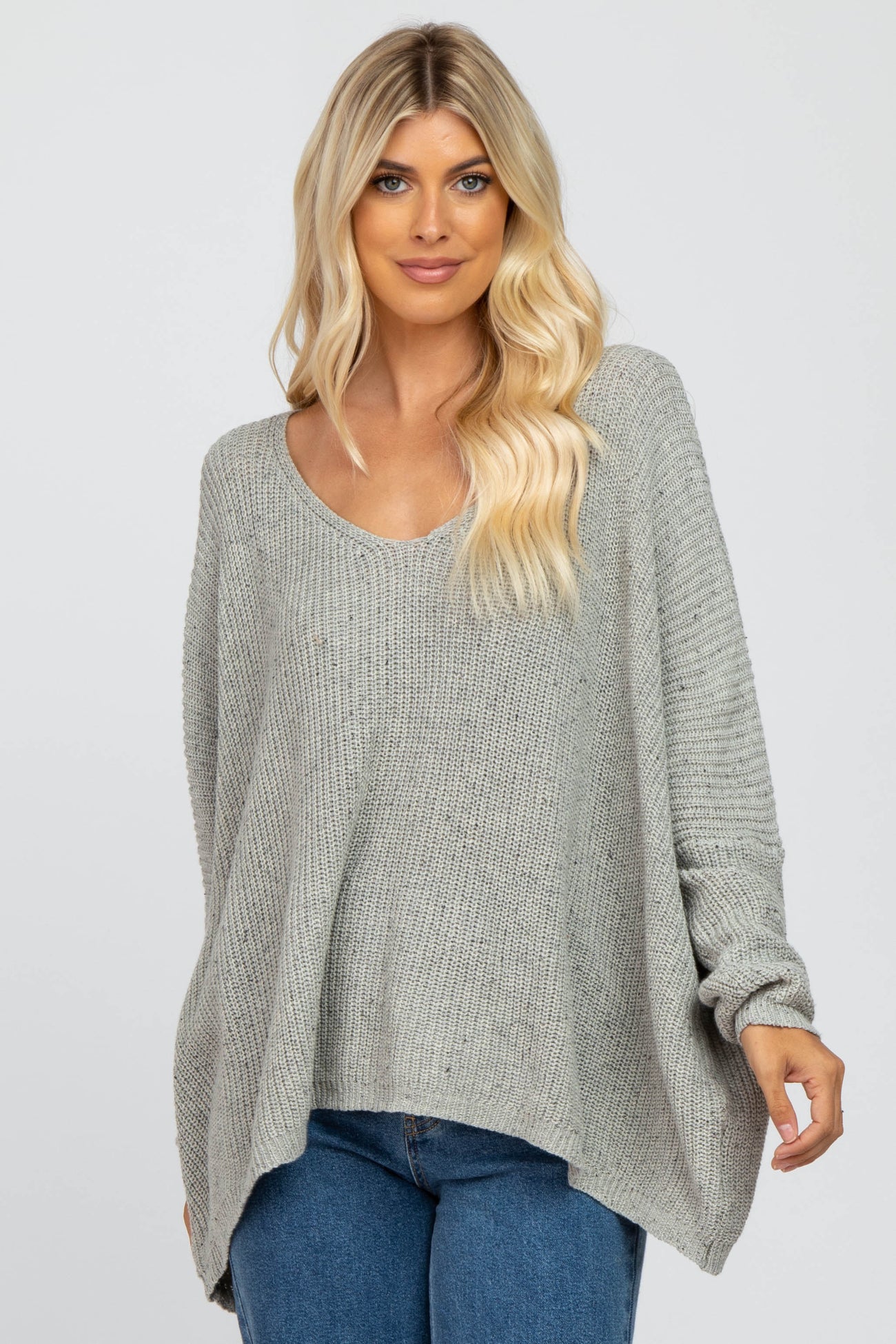 A speckled maternity sweater featuring long drop sleeves, a hi-low hemline, and a v-neckline.