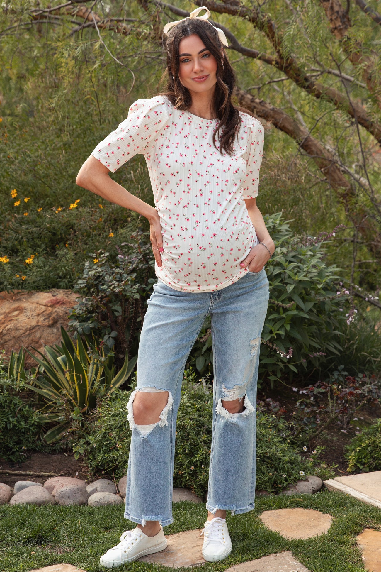 A floral print maternity short sleeve top with puff sleeves and side ruching.