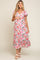 A floral maternity maxi dress featuring short sleeves, a self-tie waist, side pockets, front buttons, a v-neckline and a ruffle hem. Skirt is double lined.
