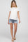A pair of maternity jean shorts with heavy distressing, five pockets, and full panel elastic belly band. Material has high stretch.