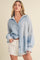 A striped button up top featuring front functioning buttons, a collar, long cuffed sleeves, a front pocket, and a round hi-lo hem.