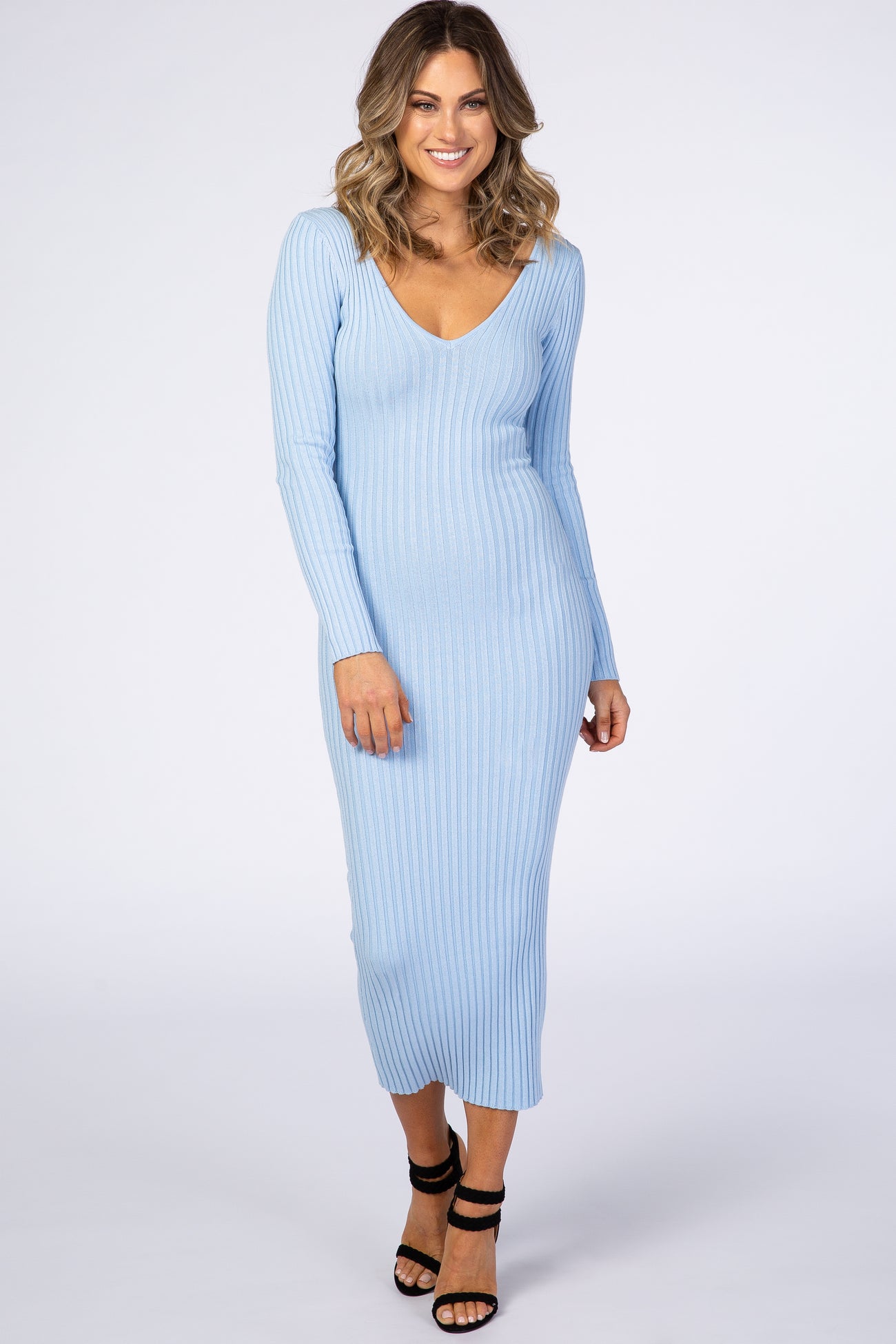 Light Blue V-Neck Long Sleeve Fitted Maxi Dress