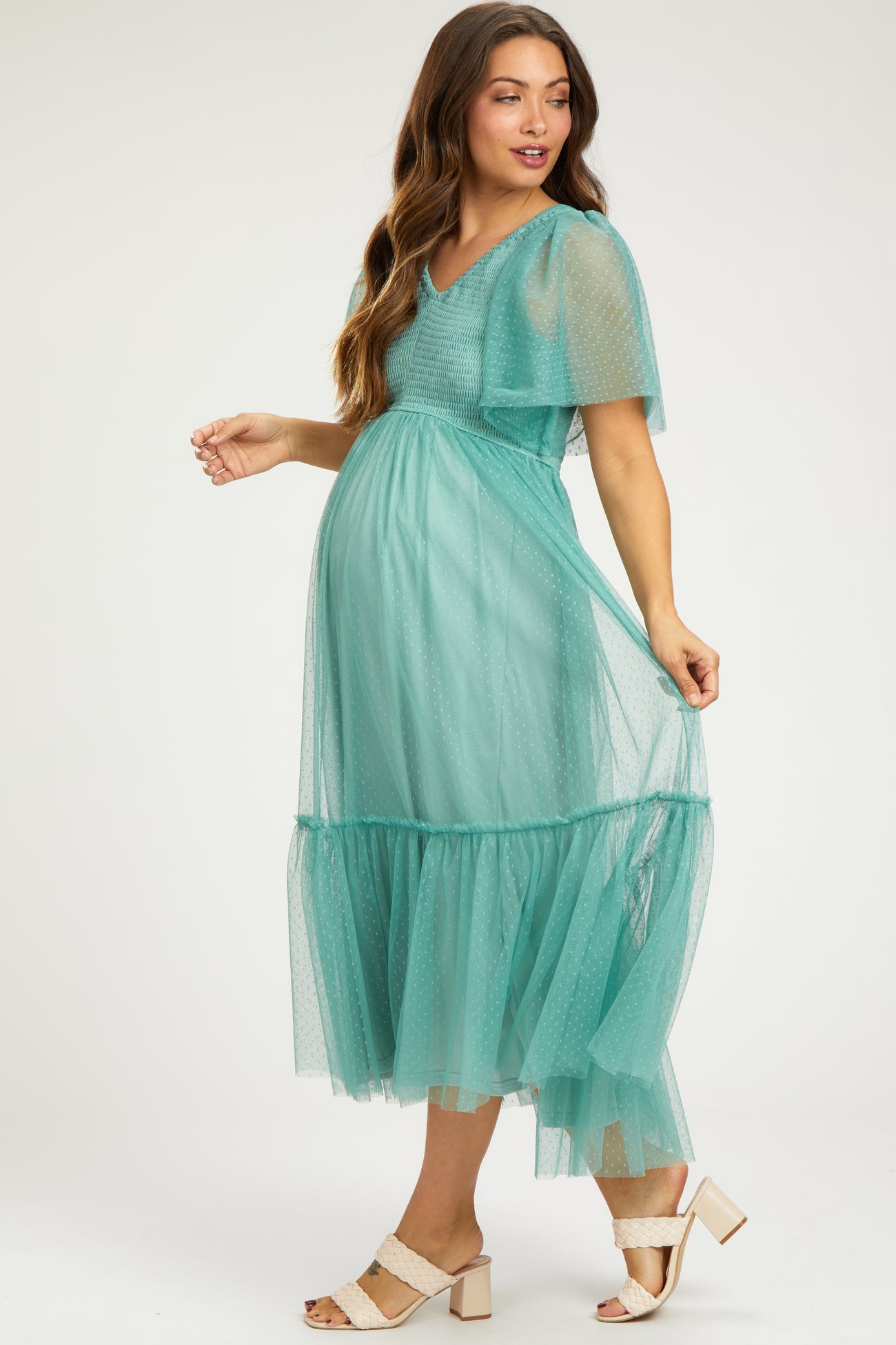 Light Olive Dotted Tulle Smocked Maternity Midi Dress