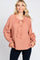 A solid long sleeve blouse with a keyhole tie closure at bust, lace inset details and smocked ruffle sleeves.