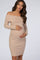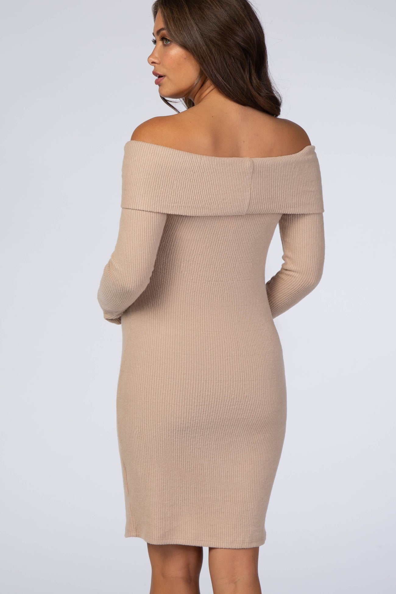 An ultra soft ribbed knit maternity fitted dress featuring long sleeves, and an off shoulder neckline with a folded detail.