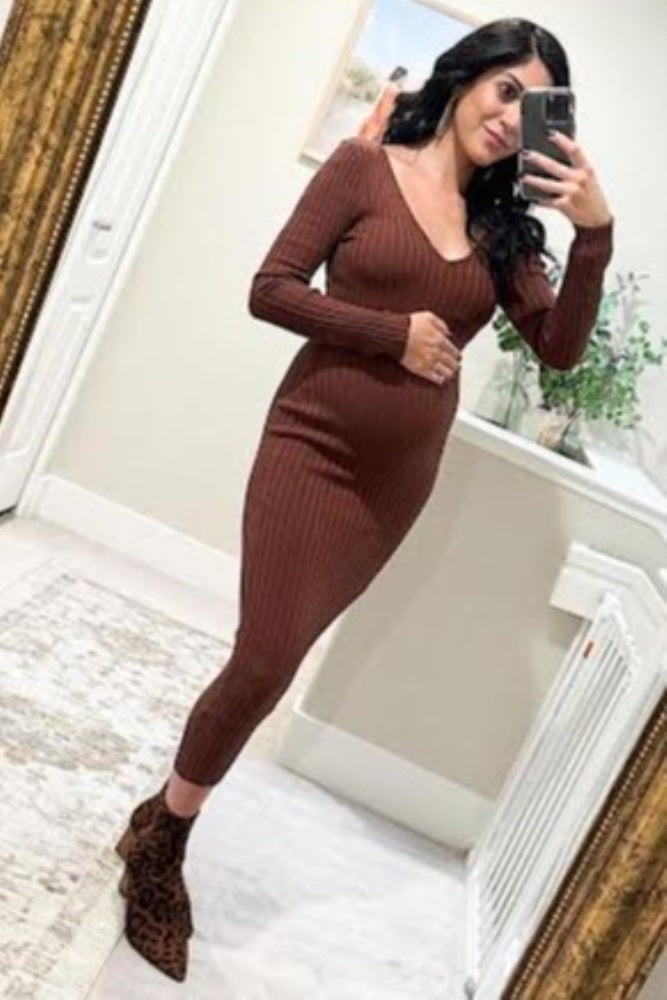 Mocha V-Neck Long Sleeve Fitted Maternity Maxi Dress