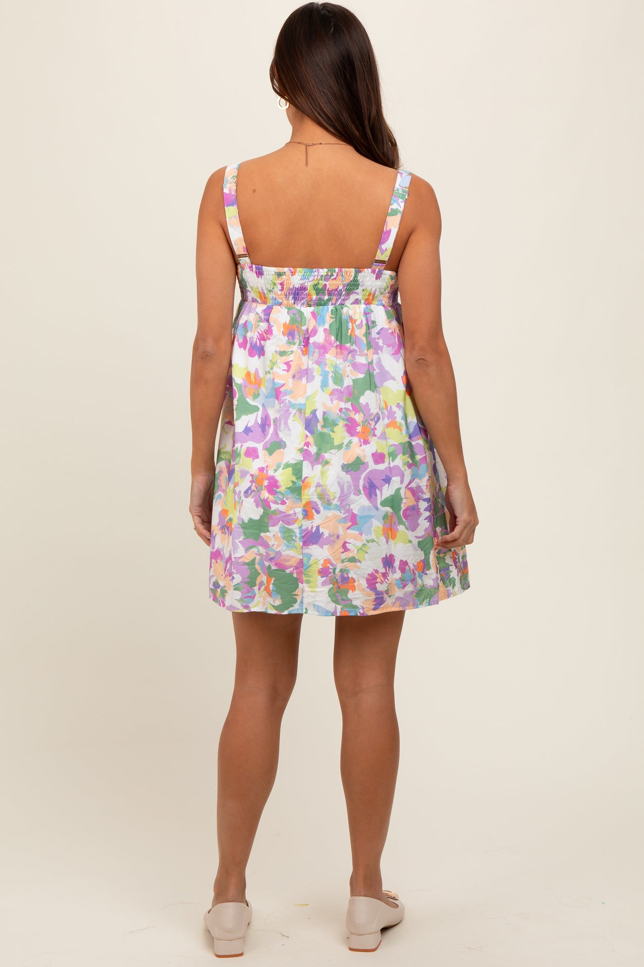 A floral print maternity dress featuring a square neckline, adjustable straps, a smocked back and shorts lining.