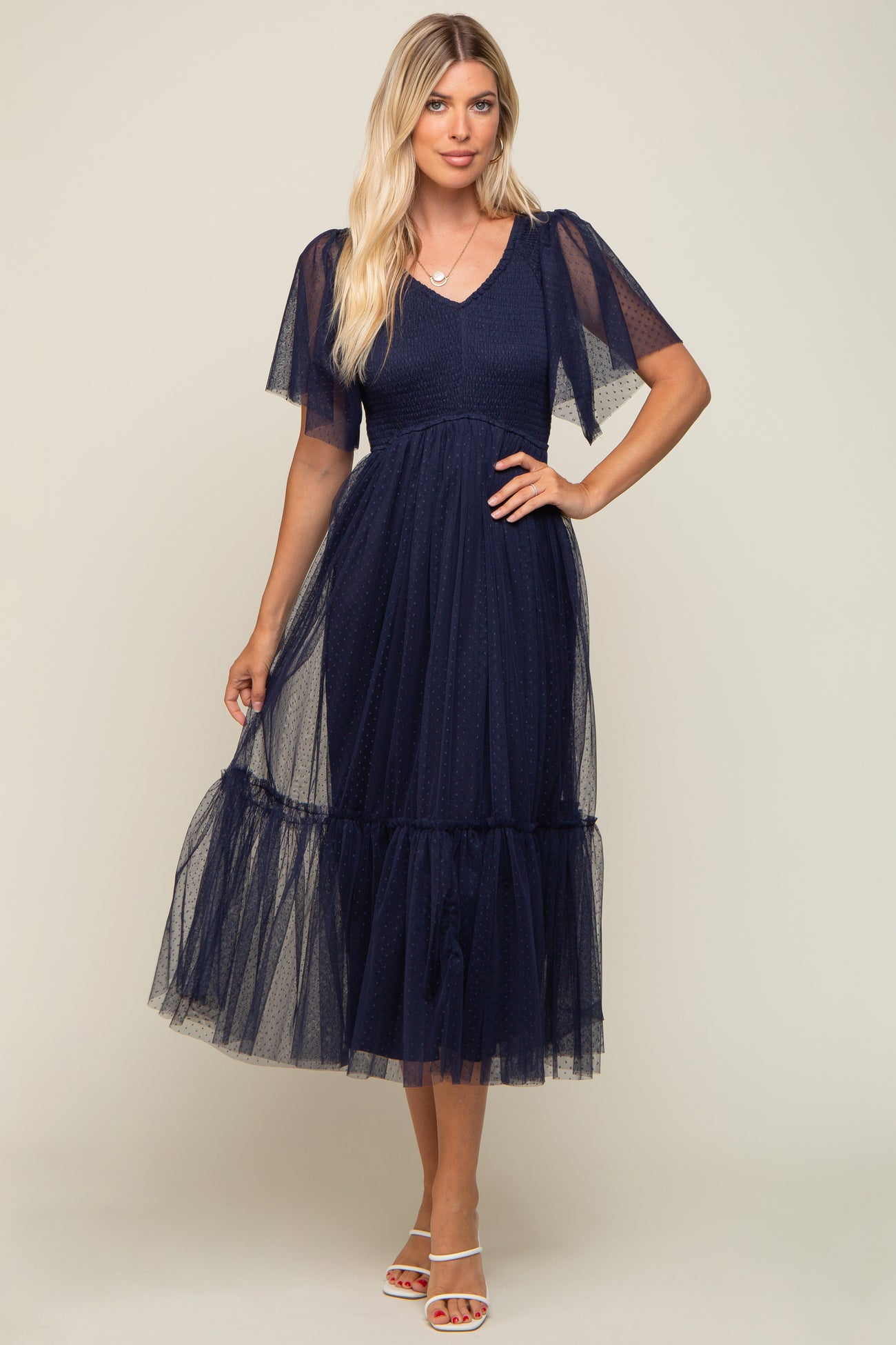Effortlessly chic, this Dotted Tulle Smocked Maternity Midi Dress is designed to celebrate your growing bump in style. Featuring playful dotted tulle overlay, a comfortable smocked bodice, and a flattering midi length, this feminine dress gracefully transitions from brunch to baby showers. The flowy silhouette and soft lining ensure all-day comfort, while delicate flutter sleeves add a romantic touch. Easily style it with your favorite sandals or heels for a look that's both trendy and timeless. Perfect for any trimester and beyond!