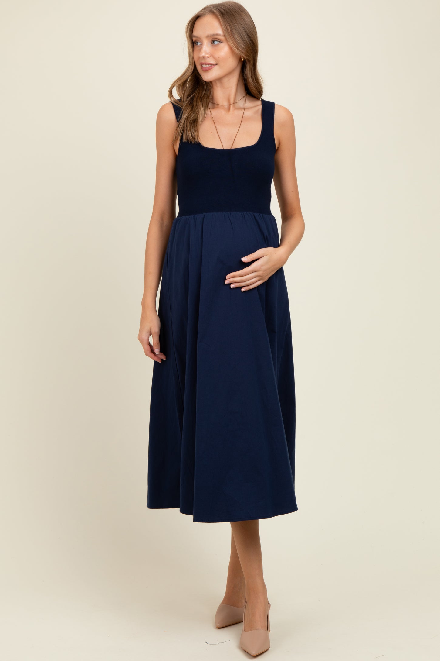 Navy Contrast Knit Poplin Sleeveless Maternity Midi Dress