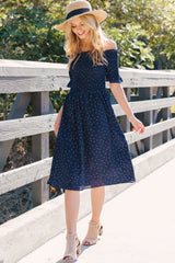 A polka dot print dress with smocked bust featuring short sleeves, an off shoulder neckline, and a slight ruffle trim.
