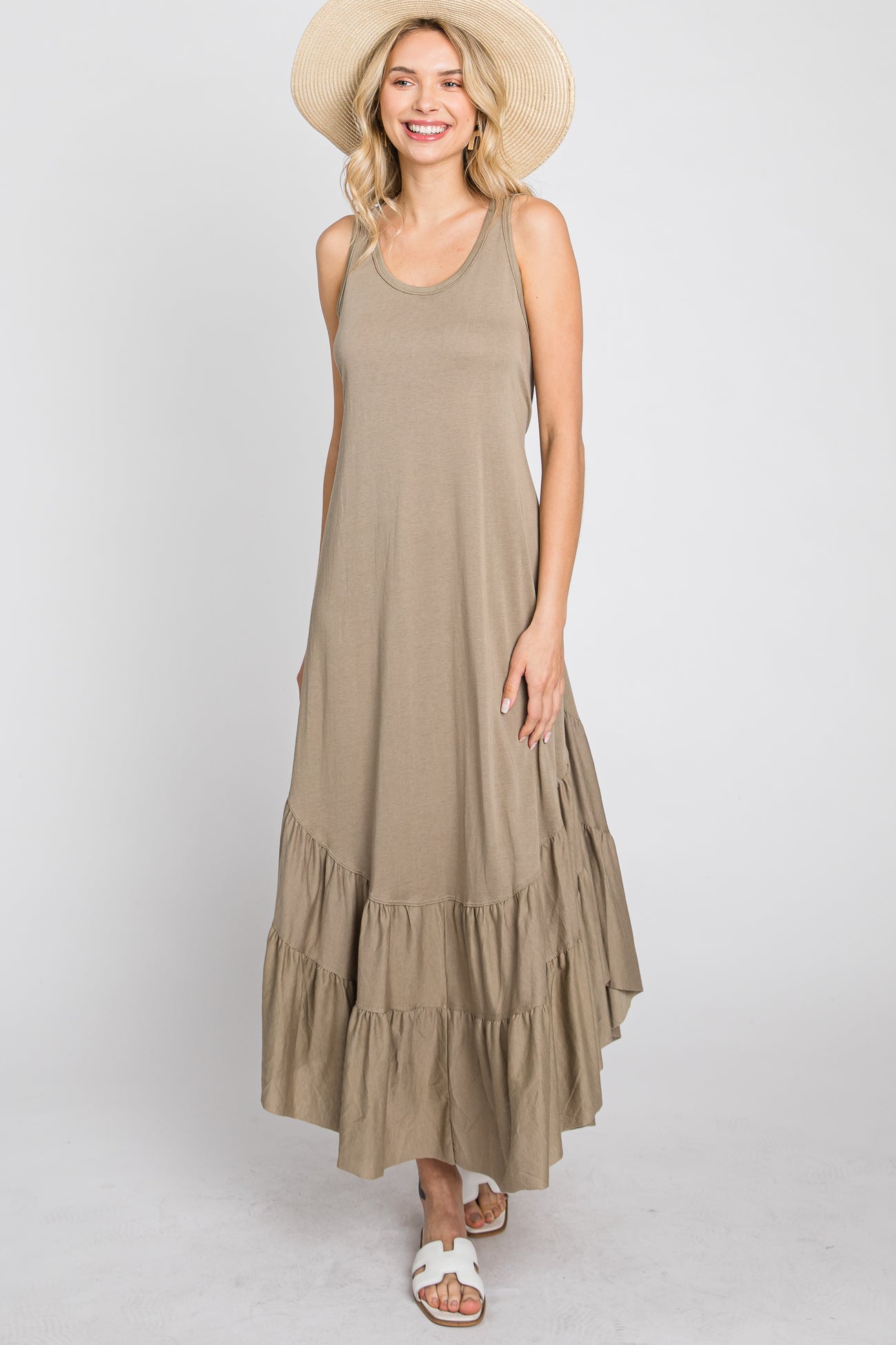 A sleeveless maternity dress with a double tiered ruffle hemline and waist tie.