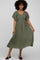 A solid dress with a v-neckline, smocked elastic bust, and ruffle accents. Double lined.