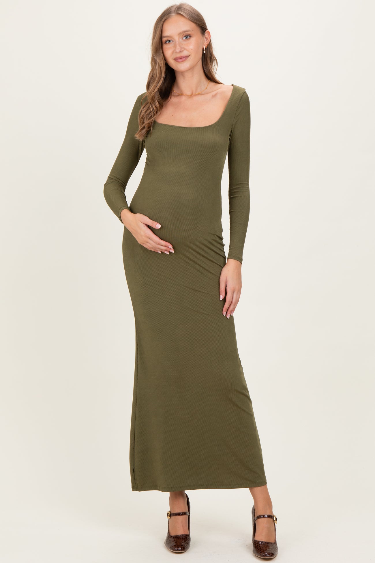 Olive Square Neck Long Sleeve Maternity Maxi Dress