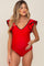 Red Color Blocked Ruffle Shoulder Cutout Back Maternity One Piece Swimsuit