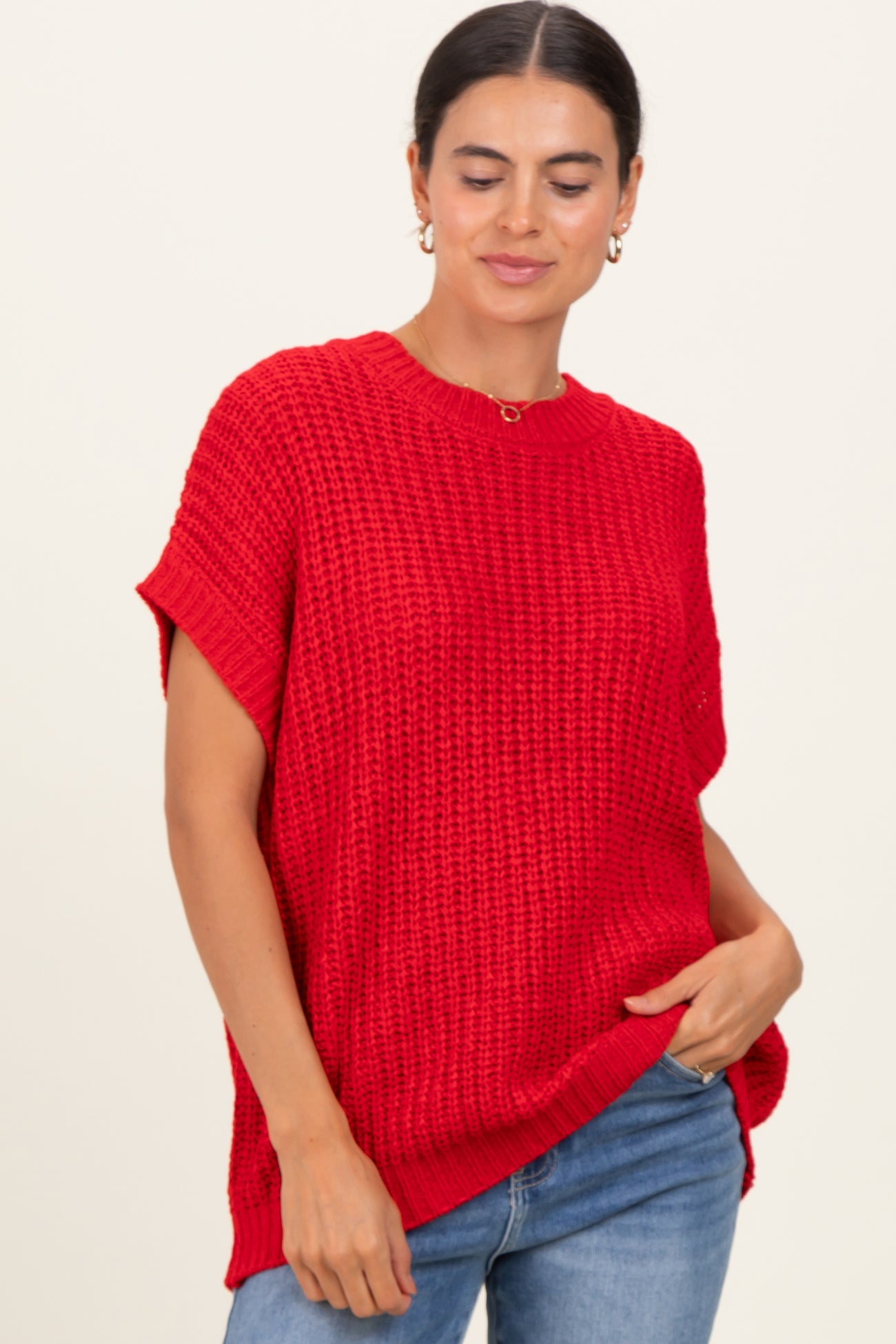 Red Short Sleeve Round Neck Sweater