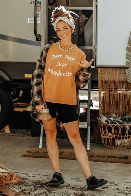 A plaid long sleeve top with a collared neckline and button down front. Features front pocket detail and button at elbow to roll up sleeve.