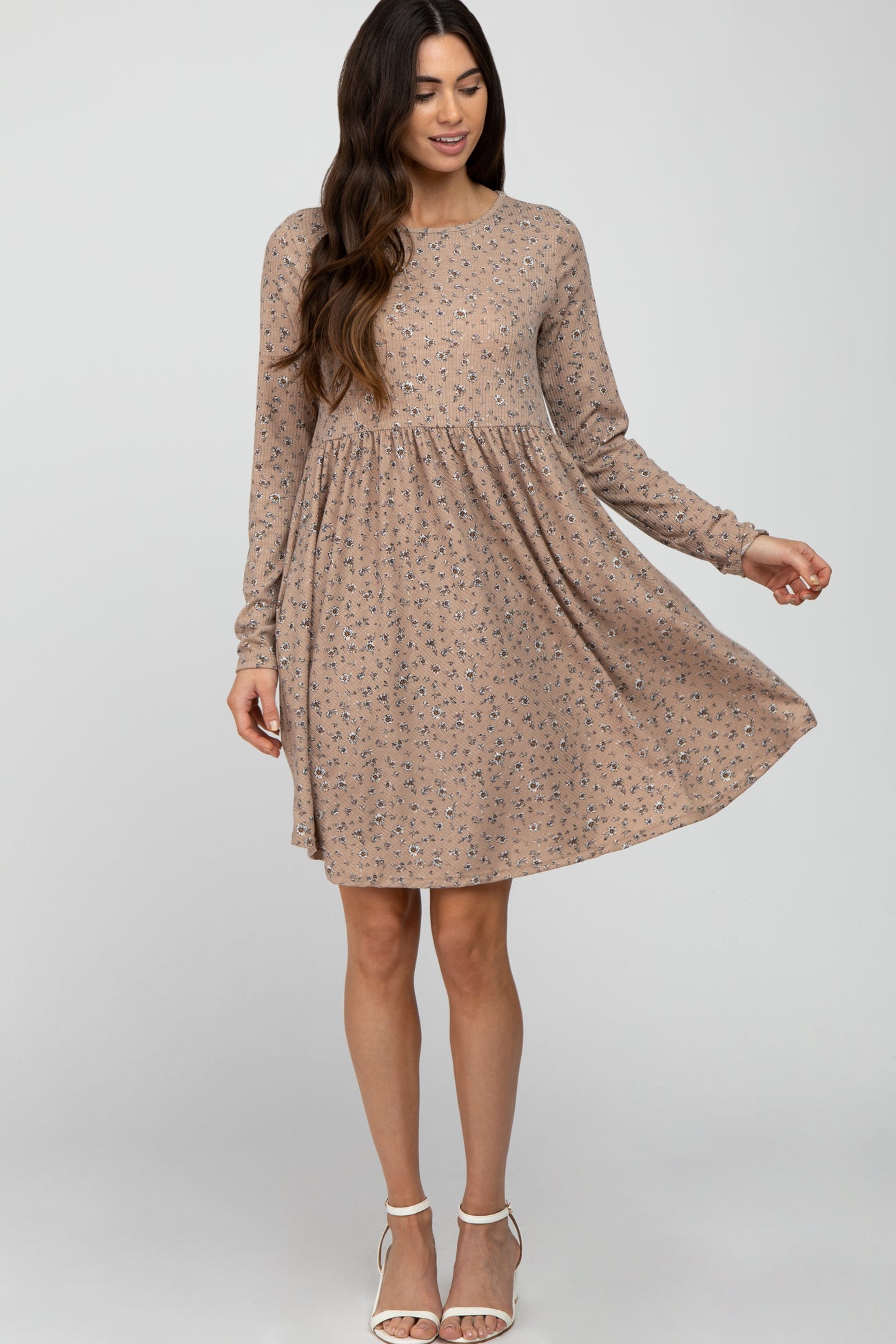 Taupe Floral Ribbed Long Sleeve Maternity Dress